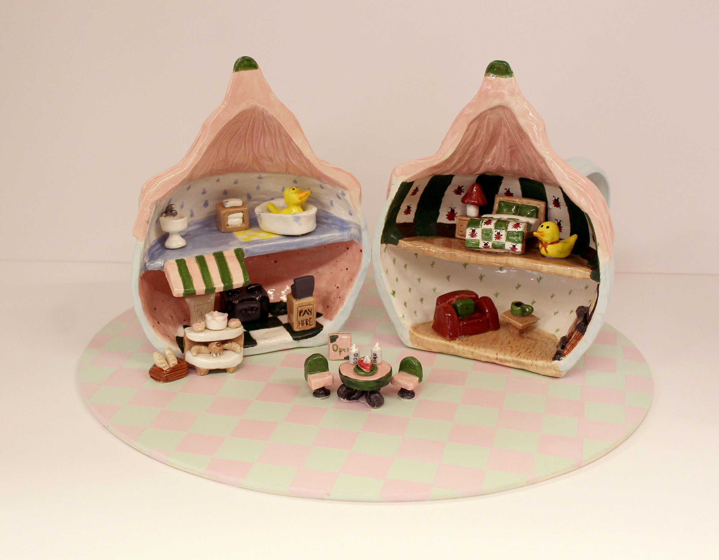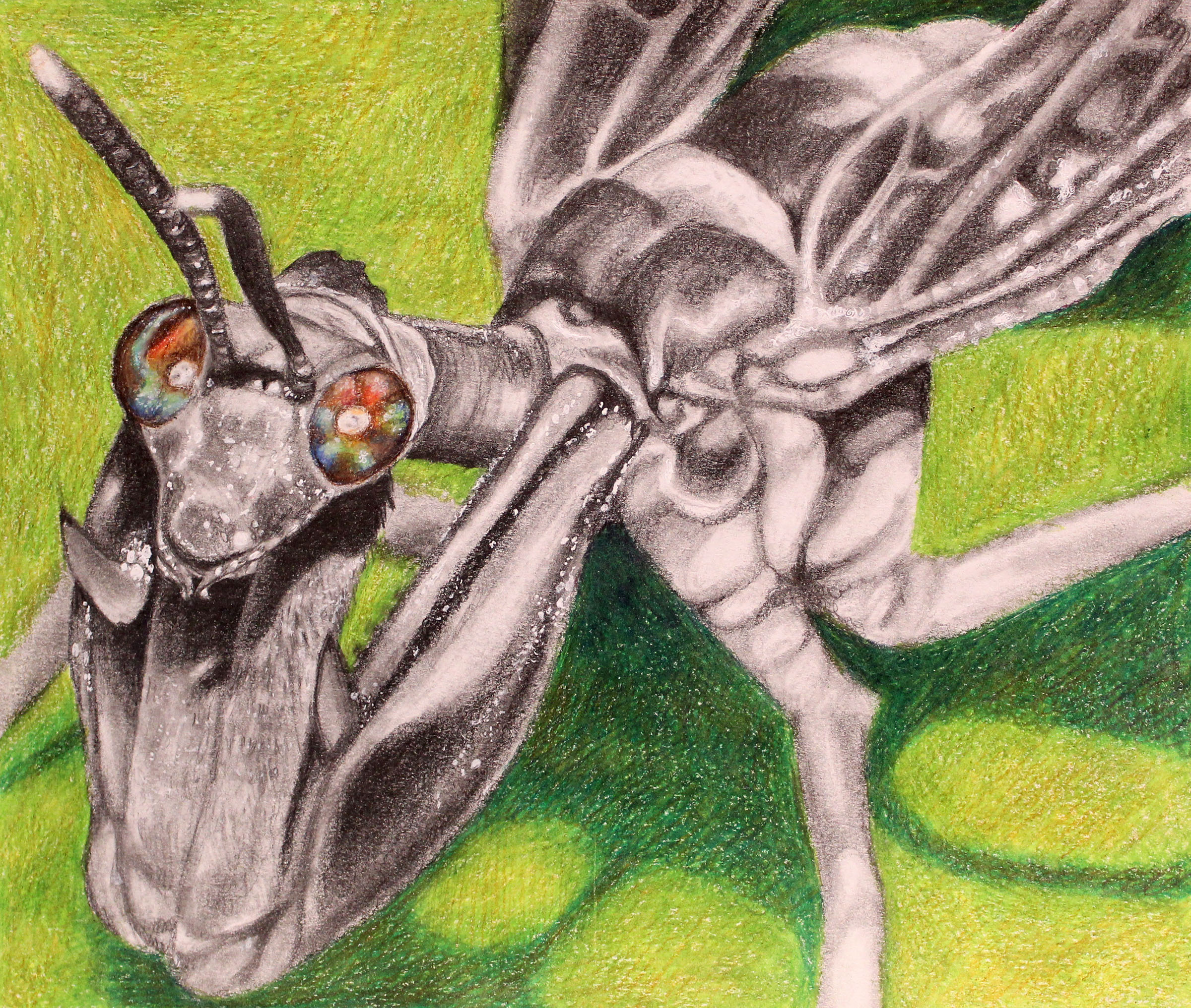 Among those selected, senior Lily Heckman has two pieces featured in the exhibit, Ellie’s Cottage and Fragments of Sight, both ceramic works. Senior Marley Hilder’s piece, Incoming Elation, is a colored pencil drawing, while senior Rain Petrie’s Aspirations of a Wasp Mantidfly combines colored pencil and graphite.